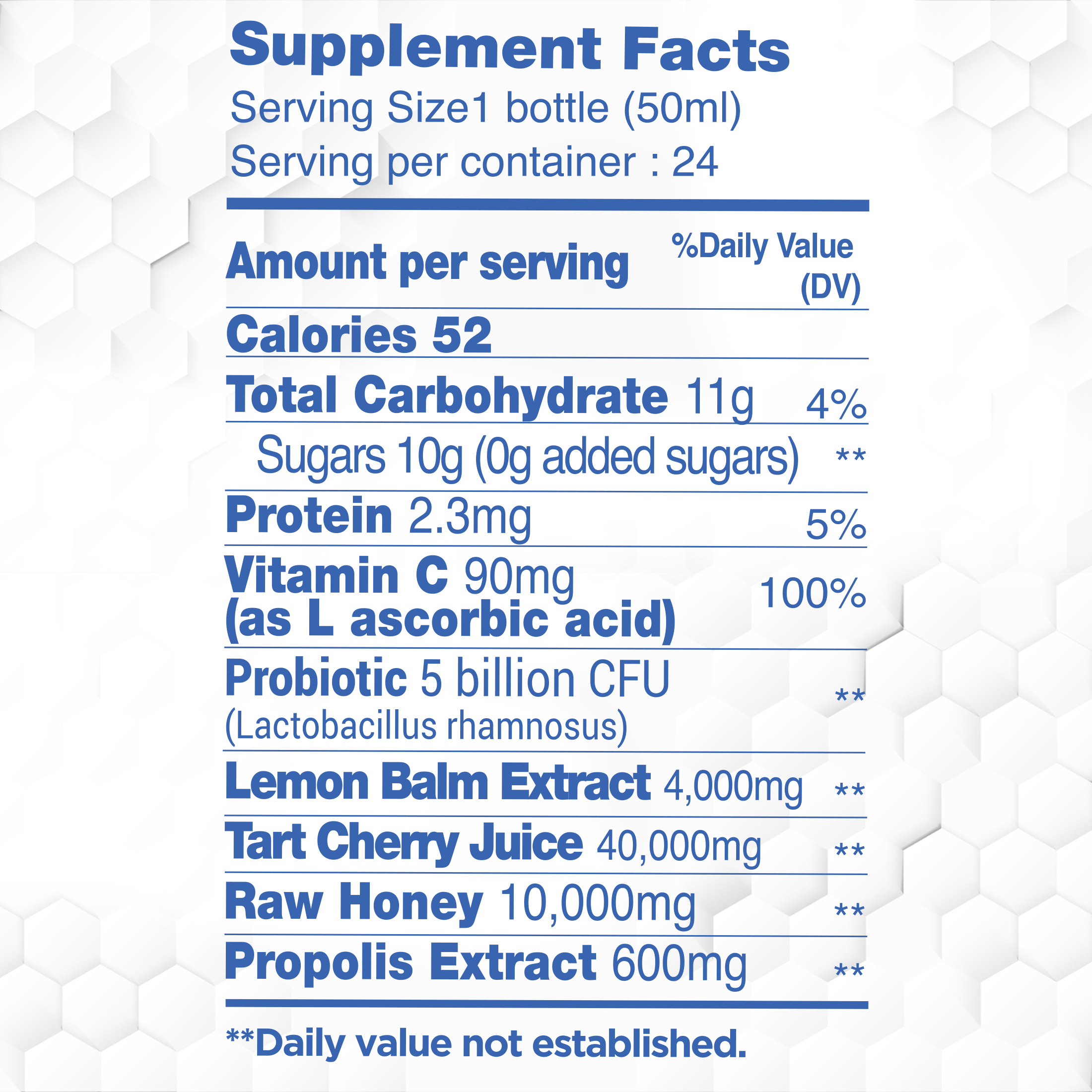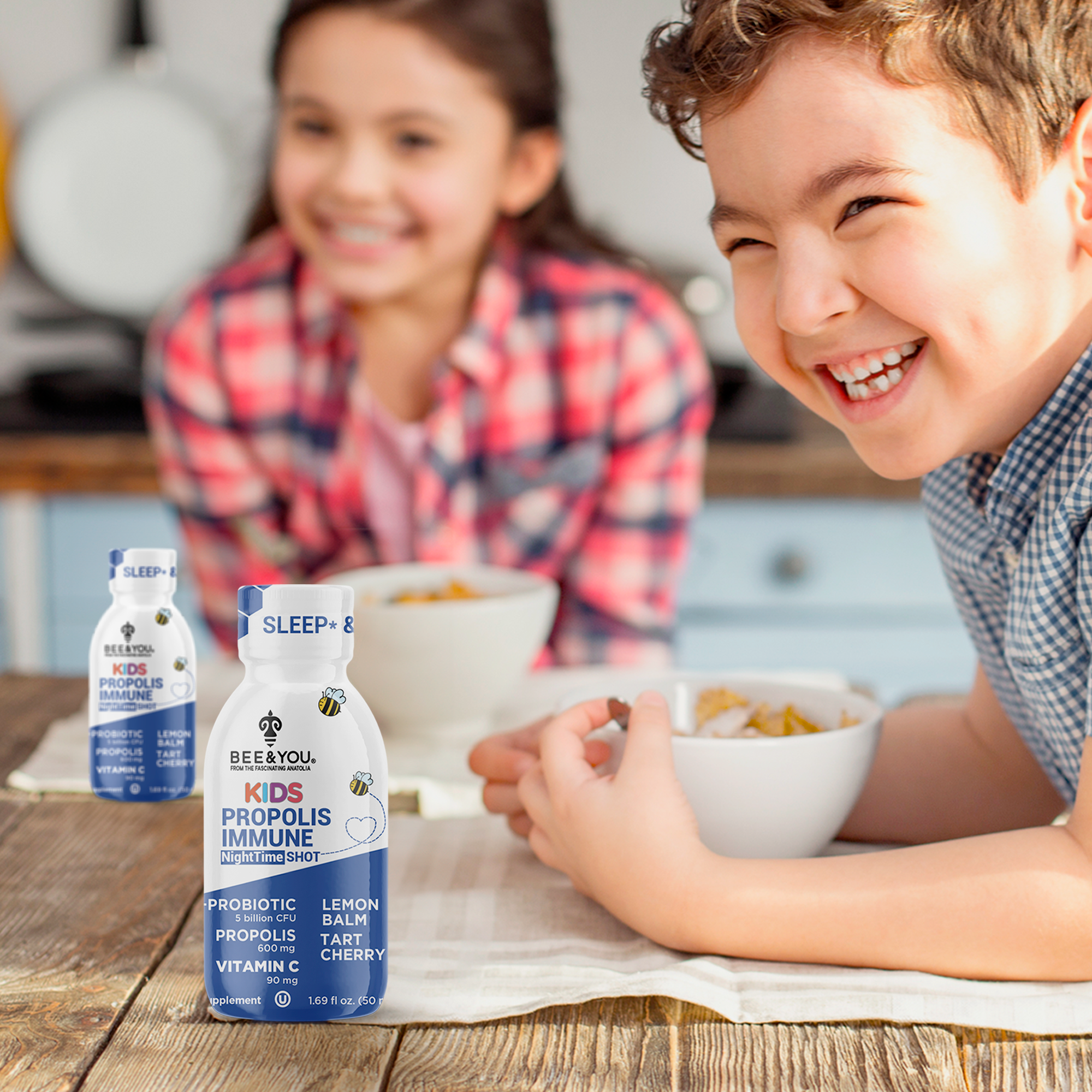 BEE&YOU Kids Propolis Immune Night Time Shot: Specially formulated with Anatolian propolis ( A.P.E), Tart Cherry Juice , Probiotic 5 billion CFU (Lactobacillus rhamnosus), Vitamin C, and Lemon Balm Extract .