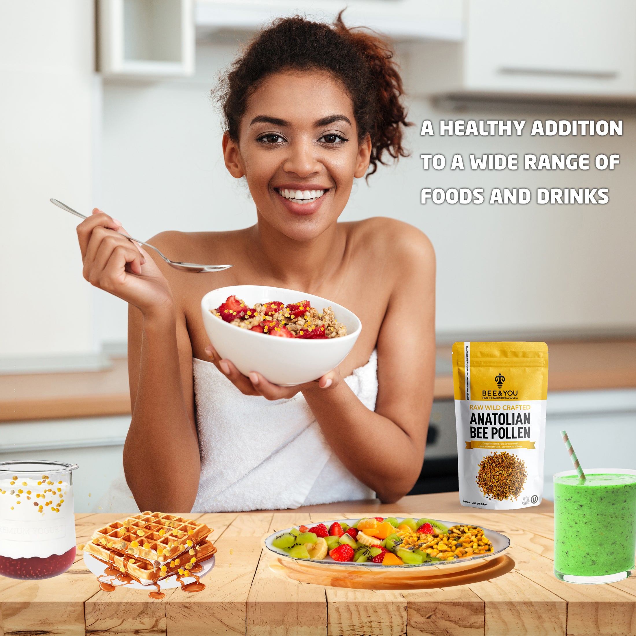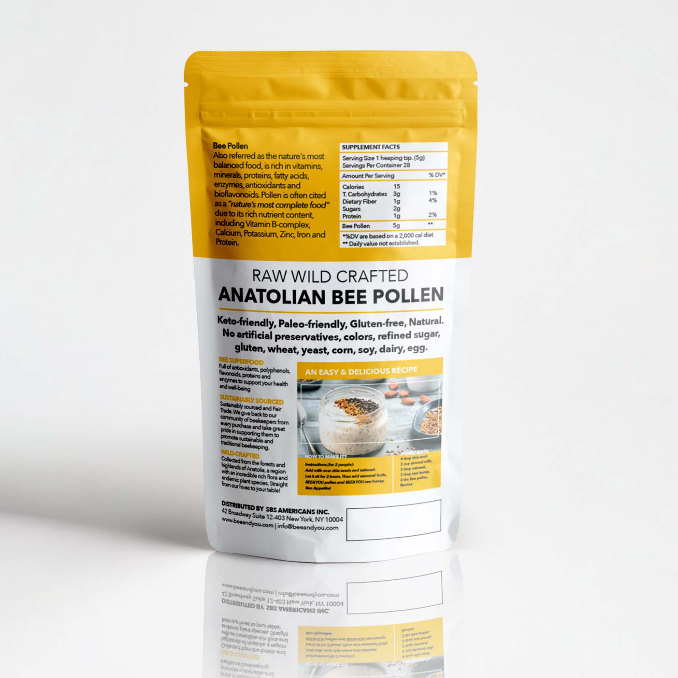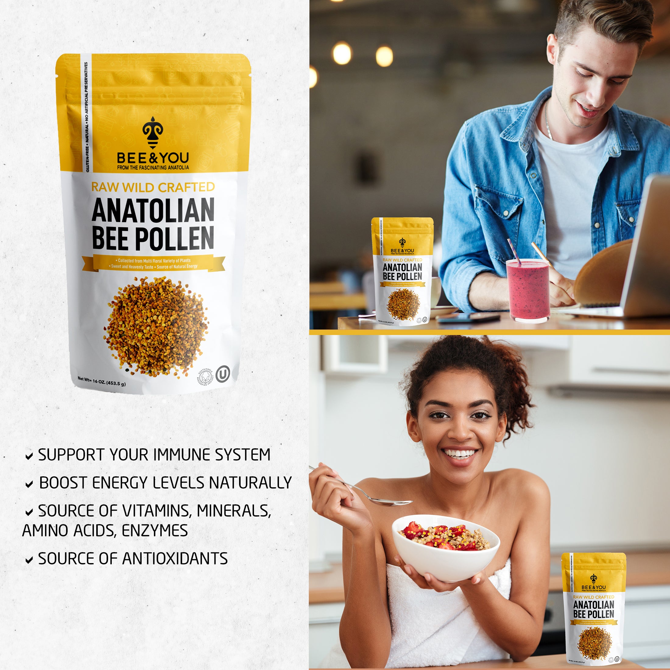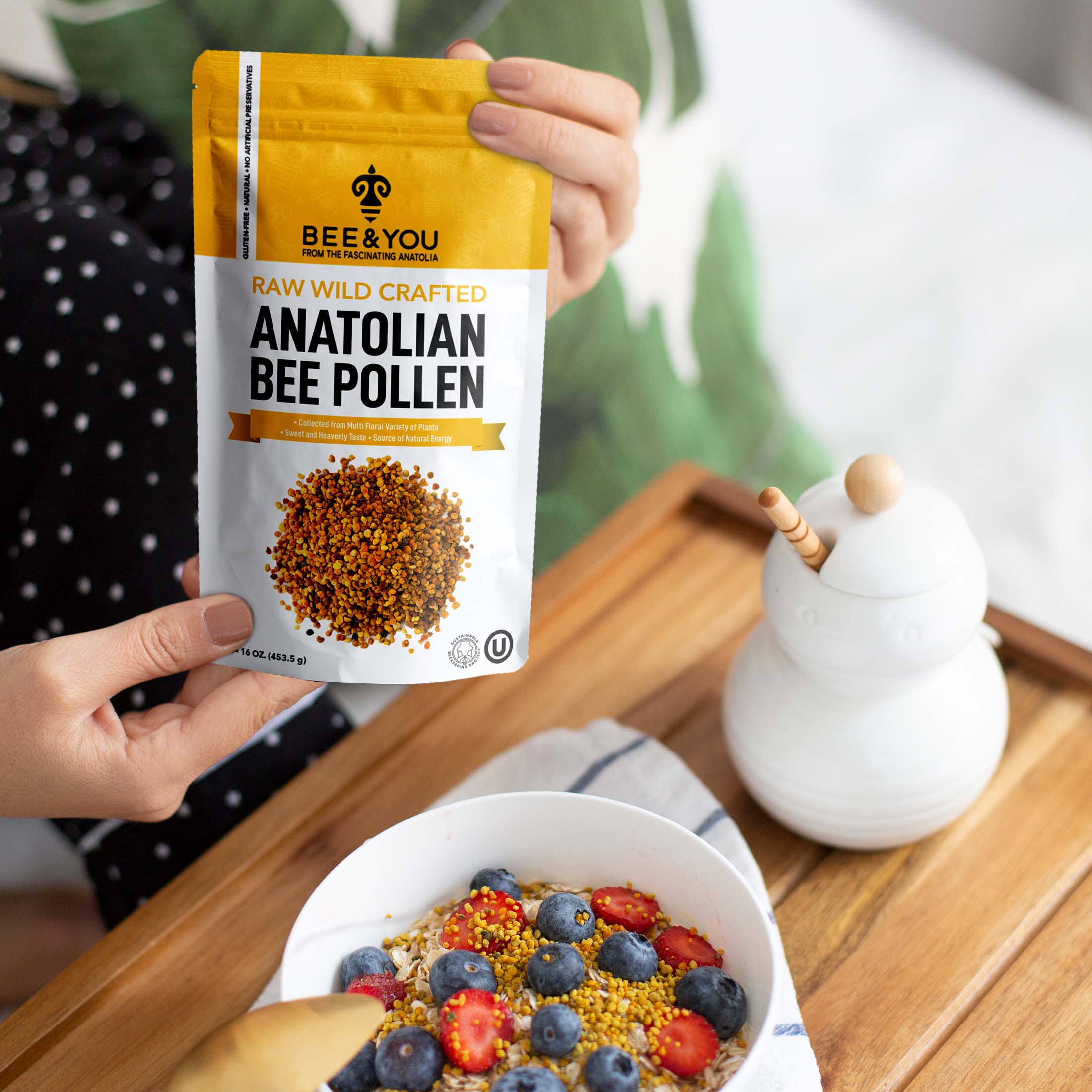 Superfood: Bee Pollen is cited as a “nature’s most complete food" after mother’s milk and egg, due to its rich nutrient content. It includes vitamins, minerals, and protein, anyone can actually survive only by feeding on pollen and water. You can consume it with your favorite recipes. (granola, yoghurt, salad, etc.)
