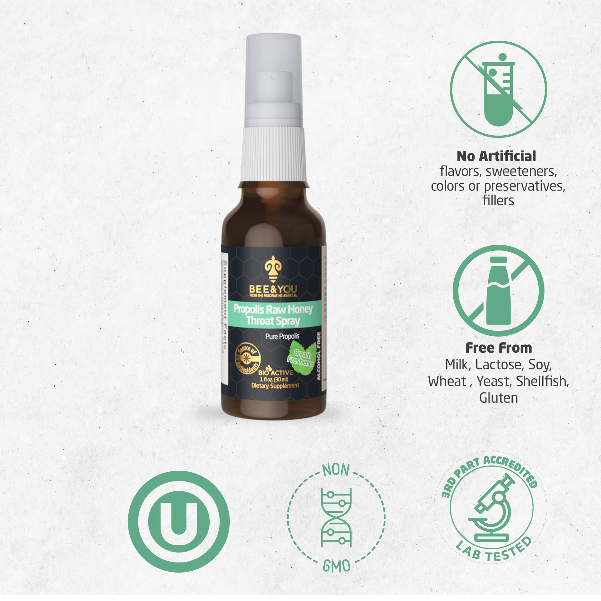 ONLY 5 INGREDIENTS: High-grade bee propolis extract, pure raw honey, menthol, non-GMO vegetable propanediol (food grade), and purified water. Contains NO: artificial preservatives, colors, refined sugar, gluten, wheat, yeast, soy, dairy, egg. People allergic to bees or bee products may experience allergic reactions. Not recommended for pregnant or lactating women