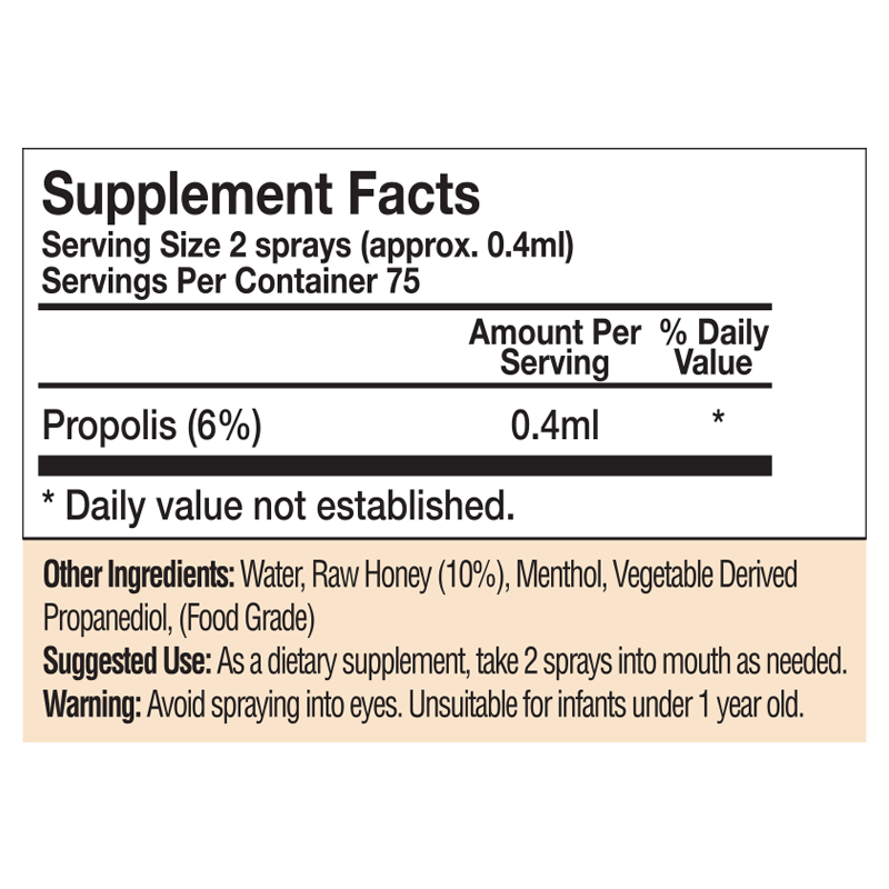 Ingredients: Anatolian Propolis Extract, raw honey, purified water, menthol, vegetable derived propanediol.