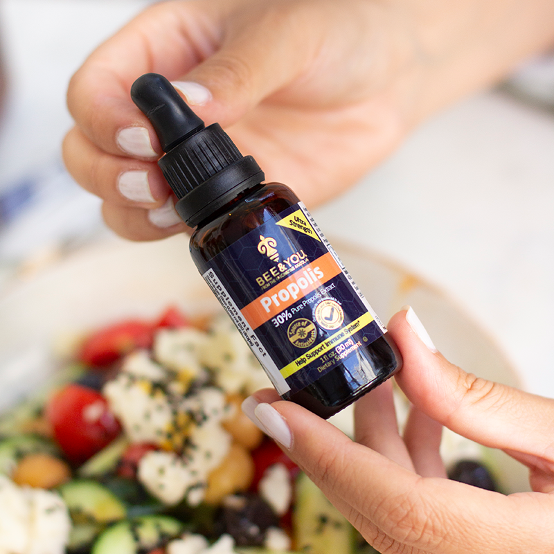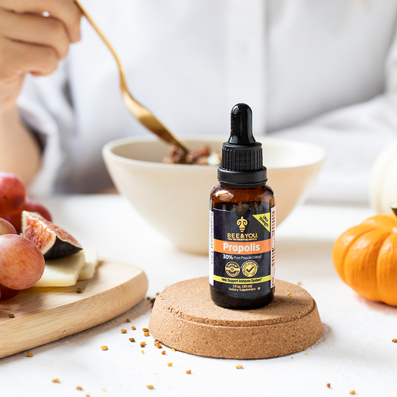 PROPOLIS*: is a natural bee product that honeybees collect from the leaves, buds and stems of the plants. It acts as a natural protective barrier. We source our propolis from pristine Anatolian mountains which is home to 12,000 different plant species and one of the most biodiverse regions in the world.