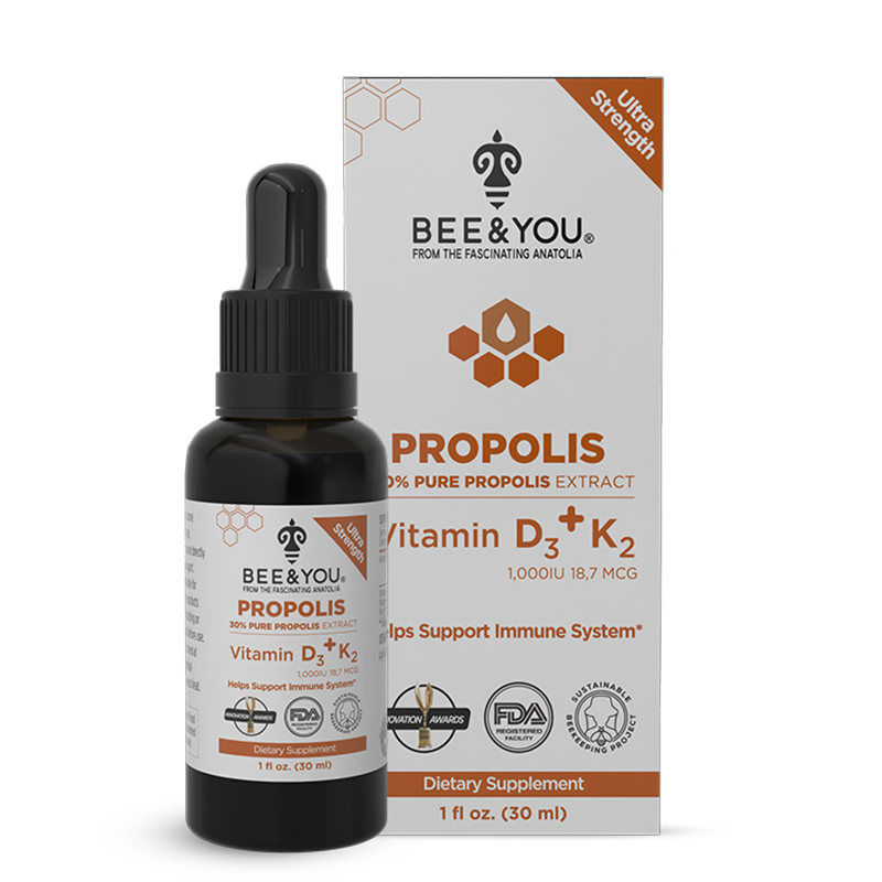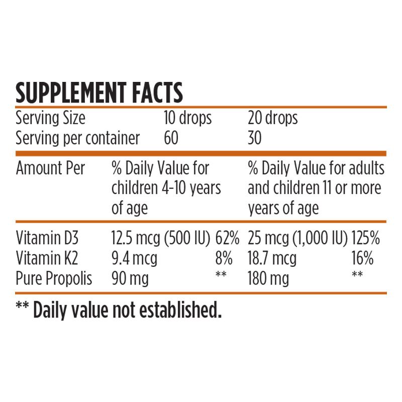 Ingredients: Pure Anatolian Propolis, Vitamin D3, Vitamin K2, Grain Alcohol (Food Grade)